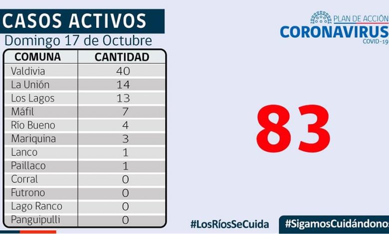 A la fecha en Los Ríos hay 83 casos activos, de los cuales 40 corresponden a la comuna de Valdivia y 14 a la comuna de La Unión .