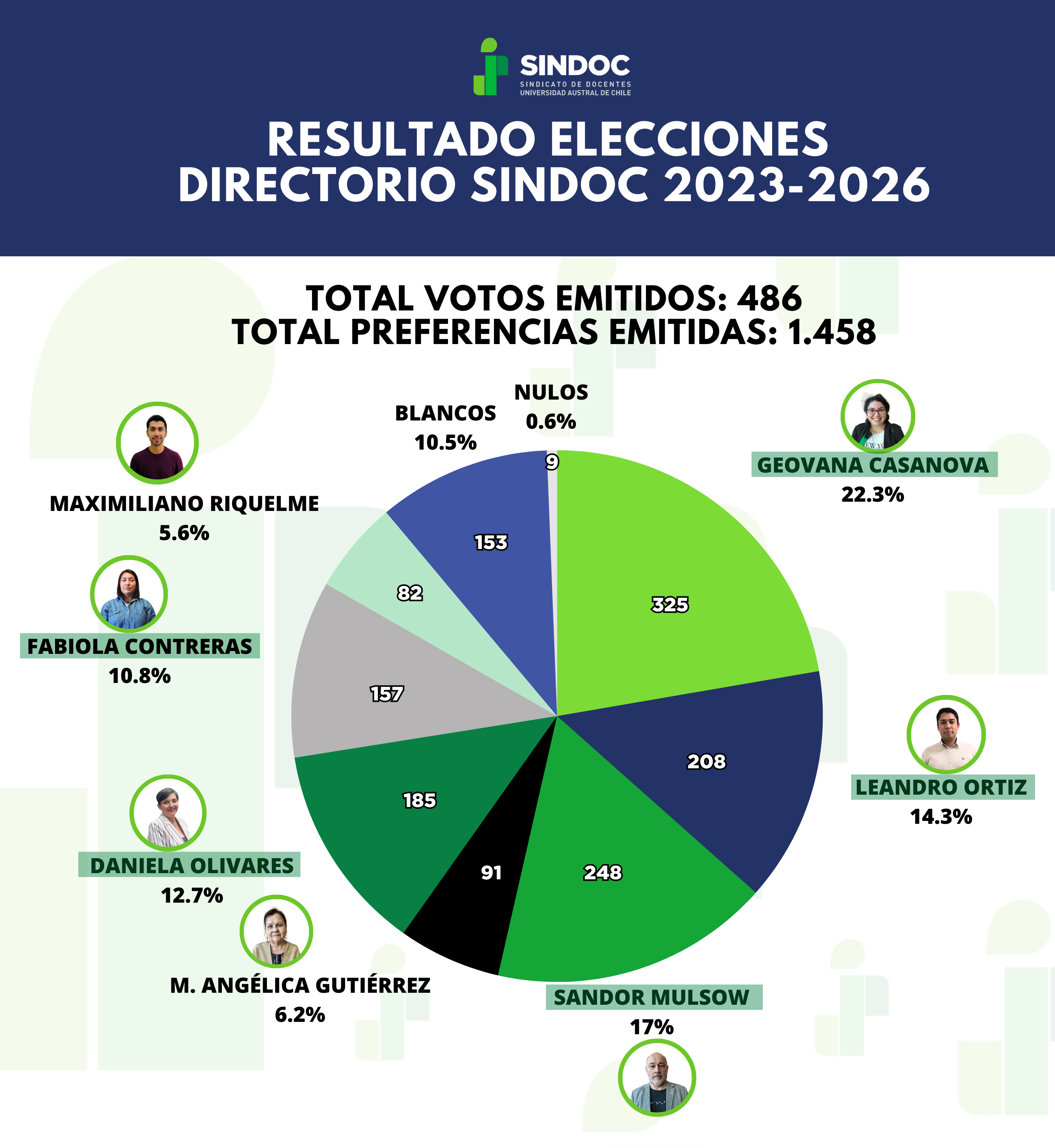Del total de habilitados para sufragar (738), el 65,85% (486) emitieron su voto, donde los resultados, por primera vez en la historia del Sindicato de Docentes de la Universidad Austral de Chile, dieron como ganadora a una candidata de la Sede Puerto Montt quien obtuvo el 22,3% de las preferencias. Así mismo el directorio completo quedó conformado de la siguiente manera: