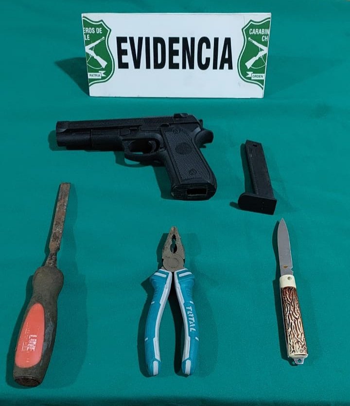 Rio Bueno: Tras persecución, Carabineros de la SIP de la 4ªComisaría detuvo a individuo que mantenía arresto domiciliario nocturno y que al advertir la presencia policial huyó por calle Pedro Lagos de esa comuna.En su poder mantenía cuchillo,alicate, formón y pistola de fantasía.