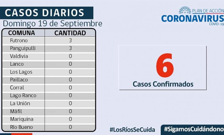 De los 6 casos confirmados por residencia en Los Ríos, 4 corresponden a casos secundarios, 1 se encuentra en investigación y 1 aún se encuentra sin trazabilidad. En tanto, a la fecha, la región presenta 49.651 casos acumulados, de los cuales 41 corresponden a casos activos, 48.957 a personas recuperadas y 653 a fallecidos.