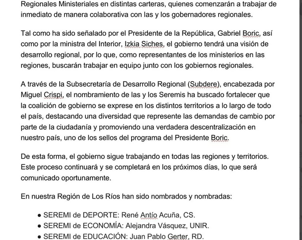 Terminó la espera en los Ríos el Gobierno designa a los nueve secretarios regionales ministeriales