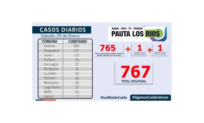 Total de nuevos contagios hoy en los Ríos 767 , 1 caso recibido desde la Región Metropolitana y 1 desde la Región de los Lagos