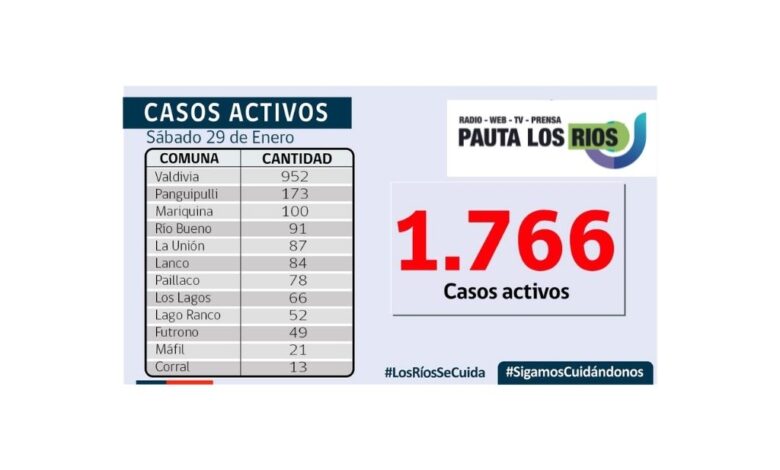 A la fecha, hay 1.766 casos activos, de los cuales 952 corresponden a la comuna de Valdivia y 173 a la comuna de Panguipulli.