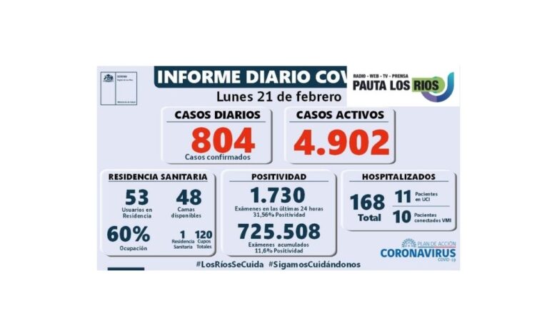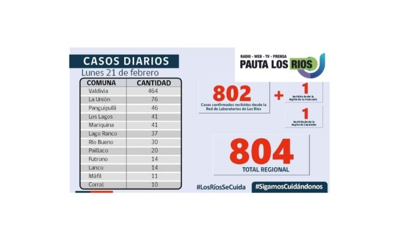 La Secretaría Regional Ministerial de Salud notificó 802 exámenes positivos para SARS-CoV-2 recibidos desde la Red de Laboratorios de Los Ríos. Adicionalmente se recibió un caso positivo desde la región de La Araucanía y un caso desde la Región de Coquimbo, por lo que hoy, Los Ríos reporta 804 casos nuevos.