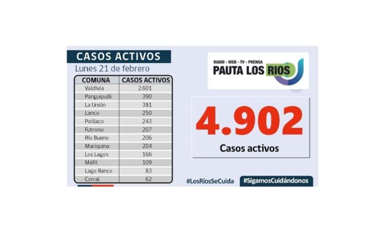 A la fecha, hay 4.902 casos activos, de los cuales 2.601 corresponden a la comuna de Valdivia y 390 a la comuna de Panguipulli.