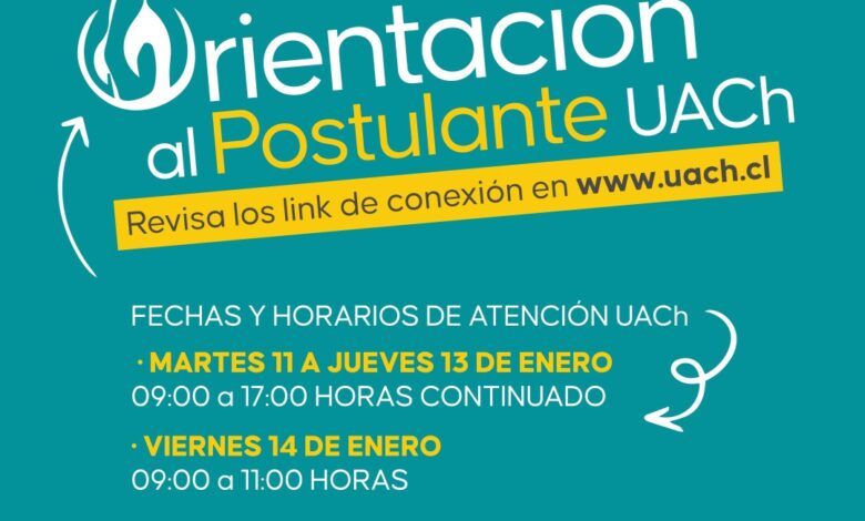 La orientación online se realizará desde el martes 11 al jueves 13 de enero, de 09:00 a 17:00 horas en horario continuado, en tanto que el viernes 14 sólo se atenderán consultas entre las 09.00 y las 11:00 horas. Participarán en este proceso Valdivia, Sede Puerto Montt y Campus Patagonia en Coyhaique, además de los equipos de PACE, Admisión y Matrículas, DAE y Difusión de Carreras.