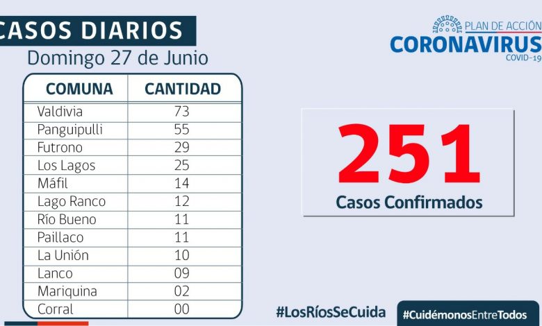 De los 251 casos confirmados por residencia en Los Ríos, 197 corresponden a casos secundarios, 32 aún están sin trazabilidad y 22 se encuentran en investigación. En tanto, a la fecha, la región presenta 45.128 casos acumulados, de los cuales 1.139 corresponden a casos activos, 43.494 a personas recuperadas y 495 a fallecidos.
