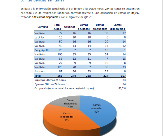 Respecto a las Residencias Sanitarias, a la fecha, 244 personas están haciendo uso de estos espacios de aislamiento, lo que representa un porcentaje de 81,2 % de camas ocupadas. Al día de hoy, quedan 107 camas disponibles en estos espacios de aislamiento.
