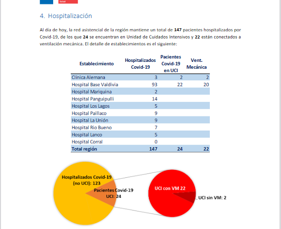 En cuanto a las hospitalizaciones, 147 pacientes se mantienen internados en distintos recintos asistenciales de la región, de los cuales 24 se encuentran en la Unidad de Cuidados Intensivos (UCI) y 22 de ellos, están conectados a ventilación mecánica. Cabe mencionar que de los pacientes internados en (UCI), 21 de ellos no han completado su esquema de vacunación.