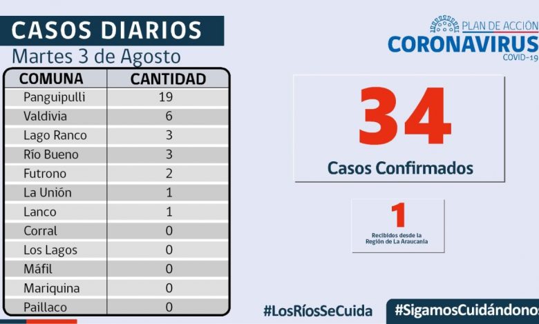 El Seremi de Salud , Keith Hood, informó que Hoy Martes 03 de Agosto, se reportaron 35 nuevos casos de COVID-19 , en los Rios. Por otro lado a la fecha en la Región de los rios , hay 284 activos , de los cuales 88 corresponden a la comuna de Panguipulli y 83 a la comuna de Valdivia.-