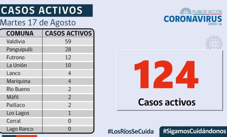 -A la fecha, en los ríos hay 124 casos activos, de los cuales 59 corresponden a la comuna de Valdivia y 28 a la comuna de Panguipulli, en cuento a la red integrada se mantienen 39 personas hospitalizadas, 9 de ellas conectadas a un ventilador, mecánico.