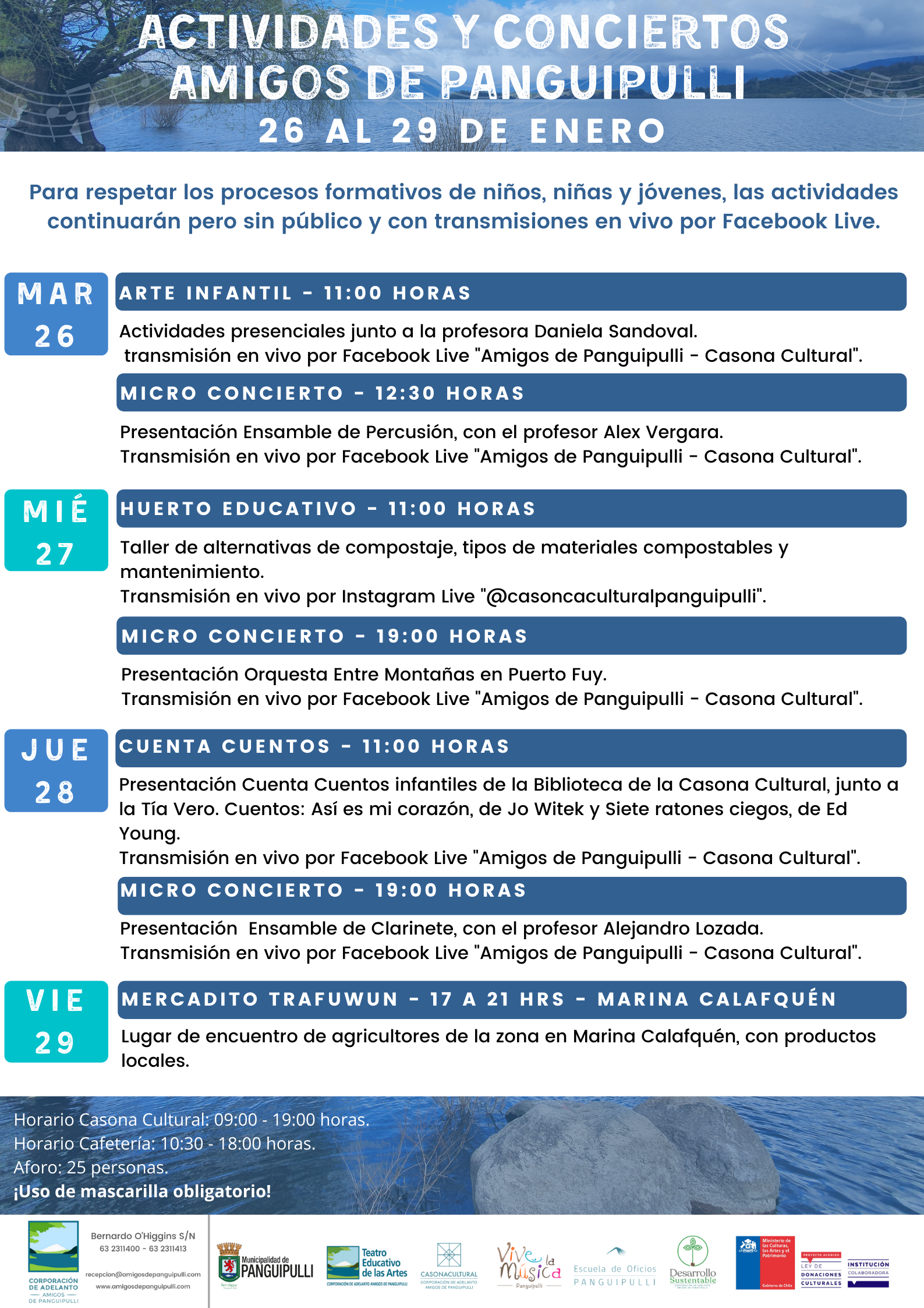 Tras la contingencia sanitaria, y con el fin de resguardar a los niños, niñas y jóvenes que dan vida a las actividades dispuestas en la Corporación de Adelanto Amigos de Panguipulli, es que las actividades próximas, se ajustarán a una modalidad online con transmisiones por el Facebook Live Amigos de Panguipulli – Casona Cultural e Instagram Live @amigosdepanguipulli.