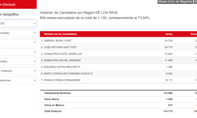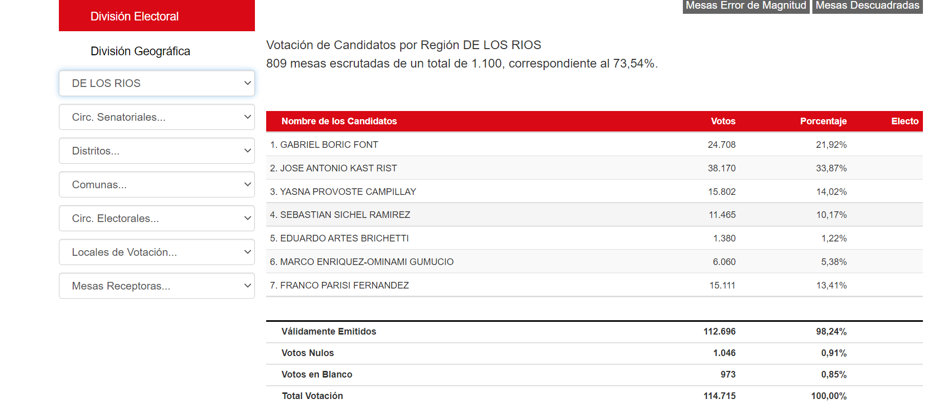 Votación de Candidatos por Región DE LOS RIOS 809 mesas escrutadas de un total de 1.100, correspondiente al 73,54%.